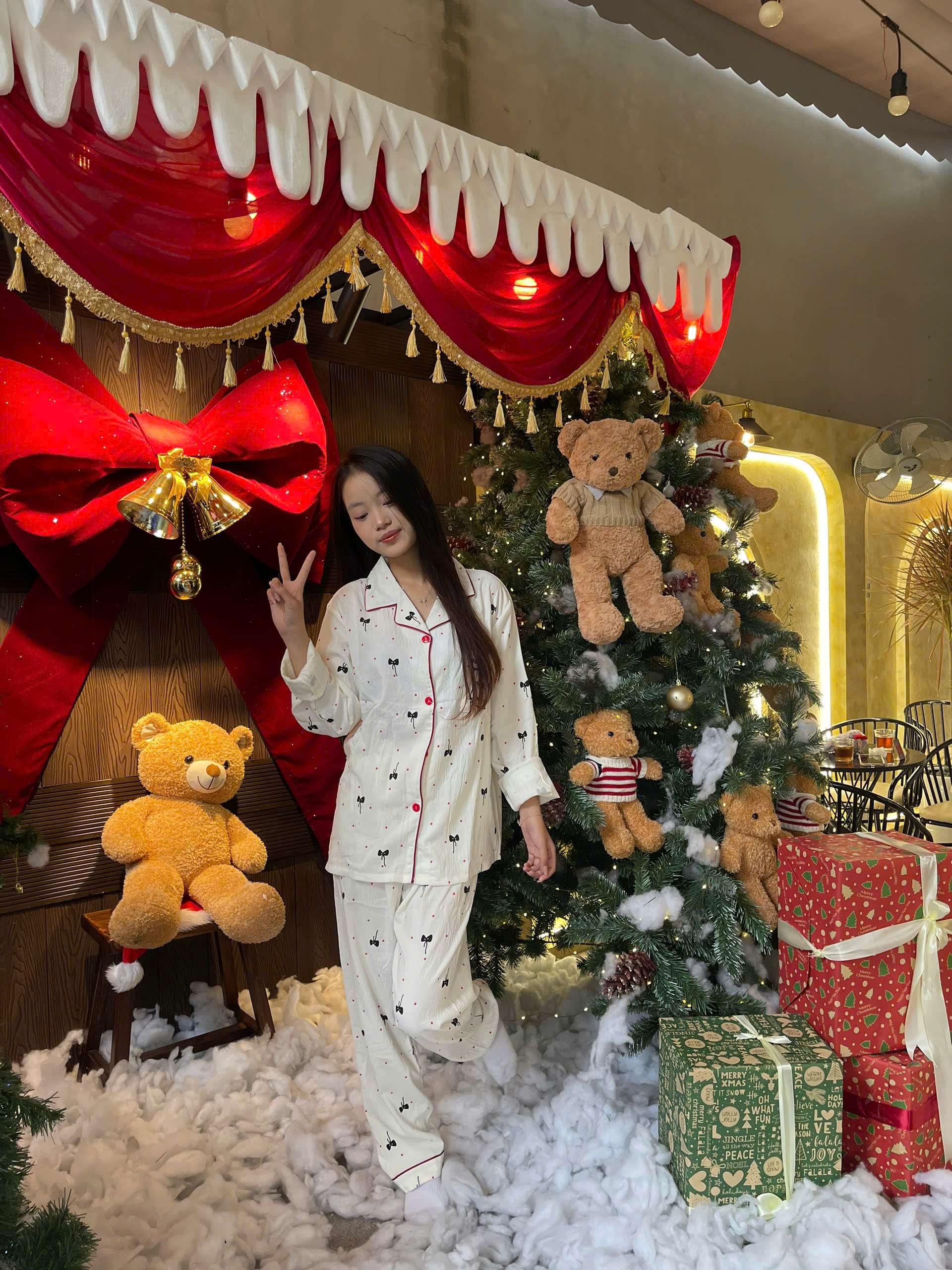 Họa tiết kitty với nơ đen huyền bí trên nền trắng tinh khôi tạo điểm nhấn nữ tính hiện đại, dễ dàng hòa quyện vào không gian sống ấm cúng. Không chỉ là bộ đồ ngủ, đây còn là lựa chọn tinh tế để bạn chăm sóc bản thân một cách tự nhiên và thoải mái.
